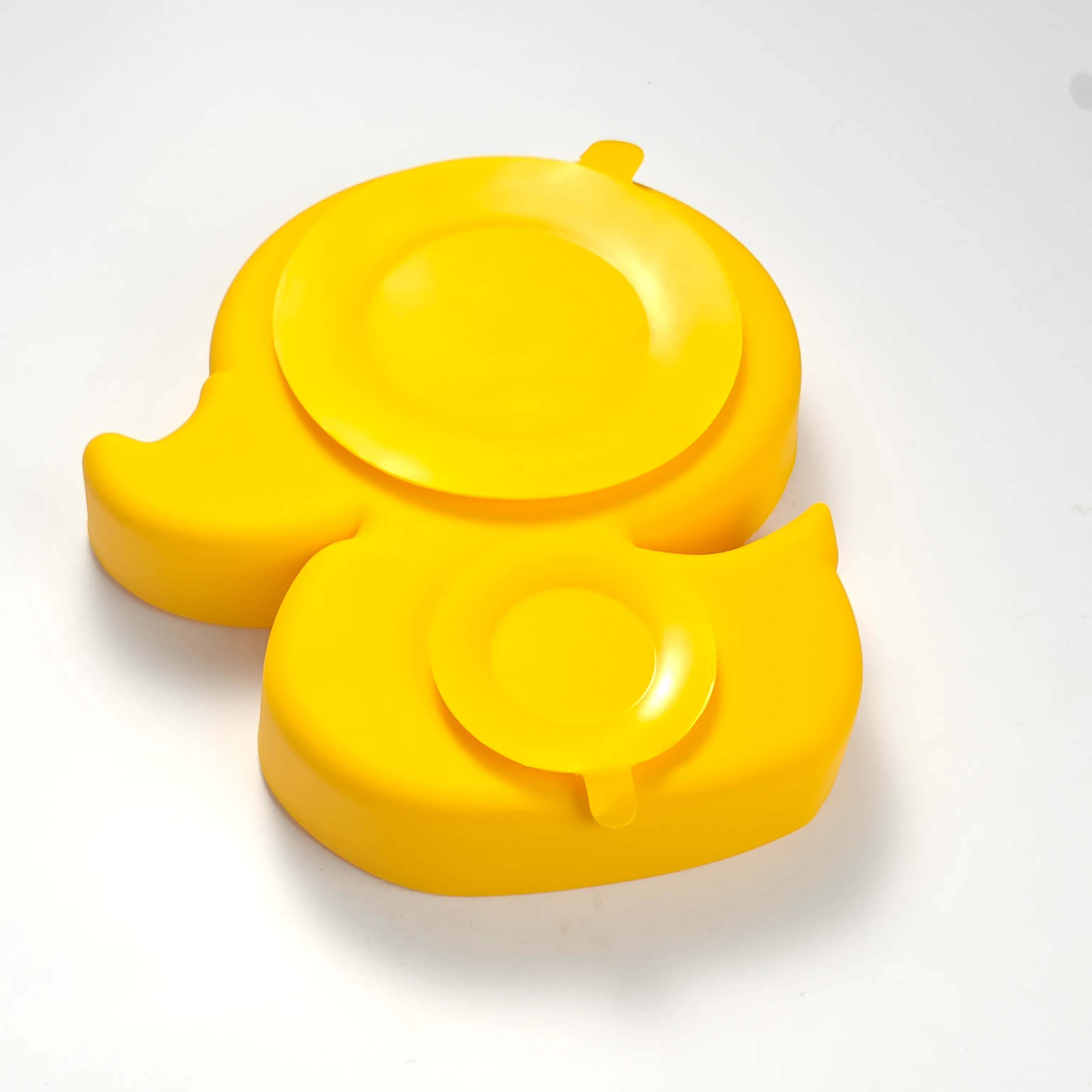 Custom kids dinnerware sets make mealtime fun, safe, and easy. Made from BPA-free food-grade silicone with stainless steel utensils, it’s durable and spill-proof. The cheerful yellow duck design keeps toddlers engaged, perfect for daily use at home or on the go.