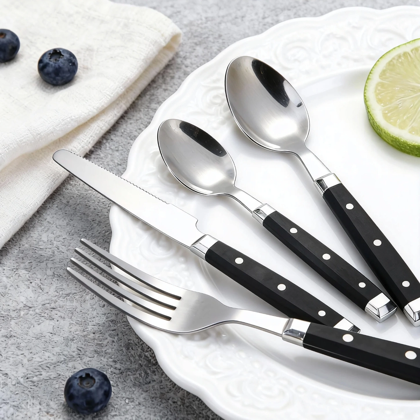 Bulk stainless flatware black handle flatware set supply combines modern design with lasting quality. Featuring durable stainless steel and heat-printed black handles, it offers comfort, style, and versatility for homes, restaurants, and retailers alike.